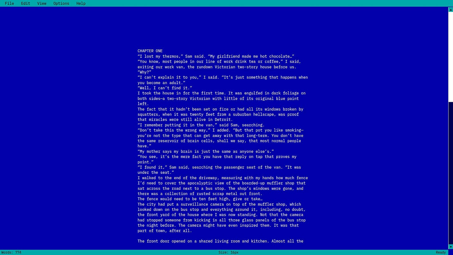 Modern word processors have become these massive applications loaded with features I'll never use. Templates, themes, collaboration tools, AI assistants, cloud sync, auto-formatting - the list goes on. But when I'm trying to write, all that stuff just gets in the way. I don't need my software to think for me; I need it to get out of my way.