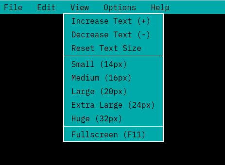 Menus include File (new, open, save), Edit (undo, redo, find, replace), and View (text size, fullscreen).